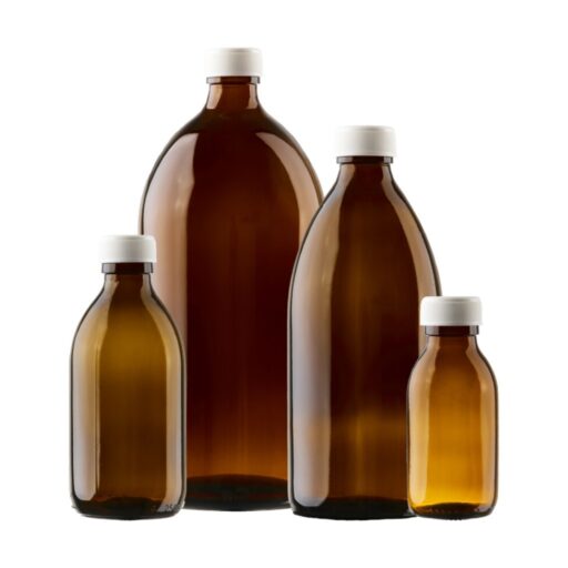 Butelki apteczne ze szkła oranżowego z gwintem o średnicy 28 mm, III klasy hydrolitycznej z nakrętką PE 28 mm z wkładką uszczelniającą.