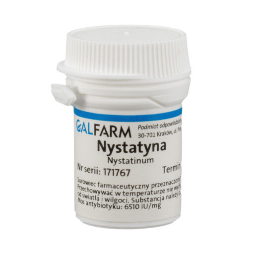Grzybobójcze i grzybostatyczne. Aktywny wobec gatunku Candida, Coccidioides immitis, Cryptococcus neoformans, Histoplasma capsulatum, Blastomyces dermatitidis oraz innych drożdży. Nystatyna w zawiesinach wodnych nie jest trwała (największą trwałość wykazuje przy pH=7), dlatego zawiesiny te powinny być zużyte po sporządzeniu. Zmiana zabarwienia proszków (zasypek) oraz maści z nystatyną z żółtego na brązowy (w całej objętości) świadczy o rozkładzie chemicznym związku. Zalecane podłoża lipofi lowe ze względu na trwałość. (American Pharmaceutical Association).